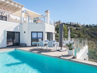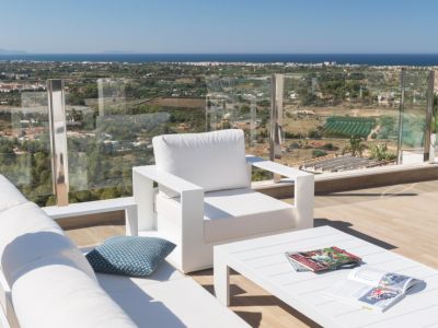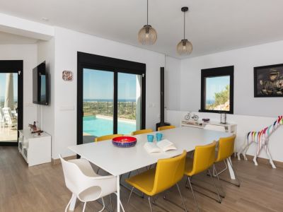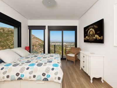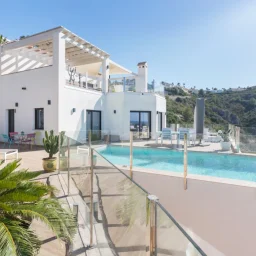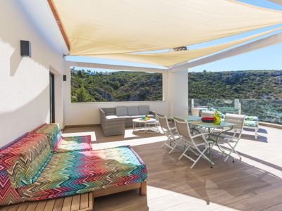 À l'extérieur, l'espace de loisirs est tout simplement spectaculaire. Une piscine à débordement semble se fondre dans l'horizon méditerranéen, entourée de grandes terrasses avec des zones de repas, de détente et de solarium protégées par des voiles d'ombrage. Les chambres sont lumineuses et offrent un accès direct à l'extérieur, permettant de se réveiller chaque matin avec une vue panoramique sur la mer et la montagne. La propriété est livrée entièrement meublée avec un style moderne et dynamique, prête à emménager.
