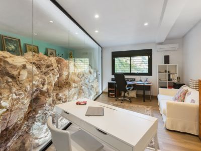 Ce chalet contemporain à Dénia se distingue par son architecture avant-gardiste et son intégration harmonieuse avec l'environnement naturel. La propriété est distribuée en espaces ouverts inondés de lumière naturelle grâce à ses grandes baies vitrées du sol au plafond. Le salon principal, équipé d'un poêle à bois moderne, fusionne avec une cuisine ouverte entièrement équipée, créant une atmosphère sociale parfaite qui s'étend vers les terrasses extérieures. L'une des caractéristiques les plus singulières de la maison est un bureau avec une paroi vitrée qui laisse apparaître la roche naturelle de la montagne, apportant un caractère organique et exclusif.