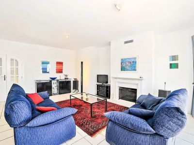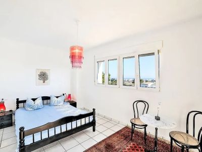 En entrant dans la villa, vous êtes accueillis dans un intérieur lumineux et aéré où les murs blancs et les sols en céramique de couleur claire créent une sensation d'espace et de propreté dans toute la maison. Le cœur de la maison est le vaste salon, qui dispose d'une cheminée à bois traditionnelle avec un manteau classique, offrant un point focal chaleureux pour la pièce. De grandes fenêtres et des portes vitrées permettent à la lumière naturelle d'inonder l'espace tout en offrant des aperçus de la mer Méditerranée. Adjacent au salon se trouve un espace salle à manger dédié, parfaitement positionné pour accueillir des repas de famille ou recevoir des invités.