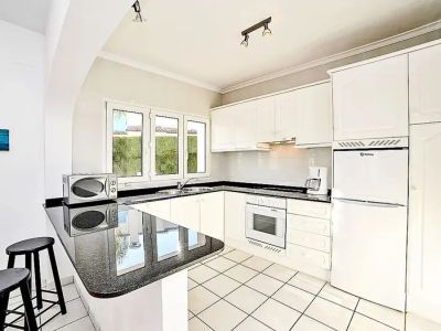 La cuisine est conçue avec à la fois style et praticité. C'est un espace semi-ouvert, séparé de la salle à manger par une large arche et un bar de petit-déjeuner avec plan de travail en granit. La cuisine est entièrement équipée avec des armoires blanches de haute qualité, offrant un grand espace de rangement, et comprend des appareils intégrés tels qu'un four, une plaque de cuisson, un micro-ondes et un grand réfrigérateur. Cette configuration permet au cuisinier de rester intégré à la conversation dans les zones de vie et de salle à manger.