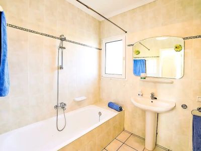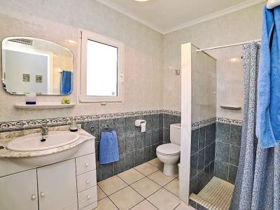 La villa propose trois chambres généreusement dimensionnées, chacune offrant une retraite paisible. La chambre principale et les chambres d'amis sont finies avec le même carrelage de haute qualité que l'on retrouve dans toute la maison et disposent de grandes fenêtres qui cadrent des vues sur les jardins luxuriants ou l'horizon bleu de la mer. La propriété comprend deux salles de bains complètes ; l'une est une salle de bains familiale avec baignoire, tandis que la seconde sert de salle de douche pratique, toutes deux finies avec un carrelage méditerranéen classique.