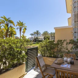 Terrasse privée carrelée avec mobilier en bois, bordée de jardinières verdoyantes offrant une vue sur les palmiers environnants.