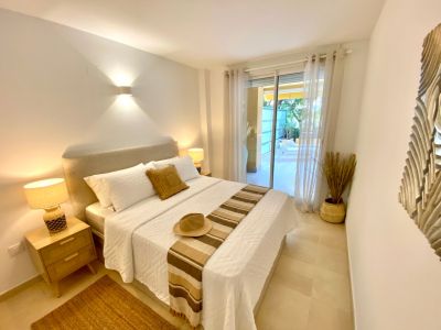 L'espace nuit se compose de deux chambres doubles avec placards intégrés. La chambre principale bénéficie d'un accès direct à la terrasse, tandis que la deuxième chambre est parfaite pour les invités ou les enfants. L'appartement dispose de deux salles de bains complètes, l'une avec baignoire et l'autre avec une cabine de douche moderne. La climatisation est assurée par des unités split dans les pièces principales. Le complexe offre des installations communautaires exceptionnelles, dont une grande piscine entourée de jardins tropicaux soignés et de pelouses.