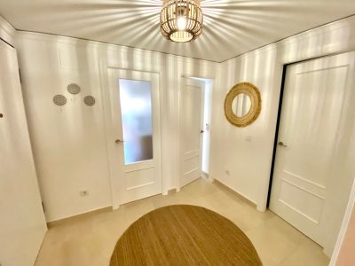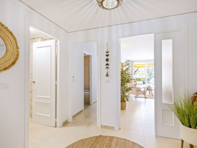 Couloir de distribution lumineux avec carrelage clair, portes blanches moulurées et miroir en osier, menant vers le salon ensoleillé.