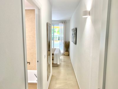 Couloir lumineux avec carrelage beige menant à une chambre avec accès terrasse. Salle de bain attenante avec faïence murale de ton neutre et baignoire.