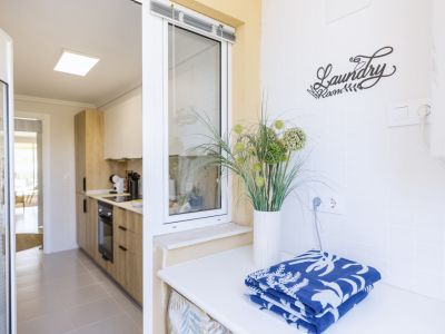 Espace buanderie fonctionnel avec plan de travail blanc, situé à côté d'une cuisine moderne avec des meubles en bois et de l'électroménager encastré.