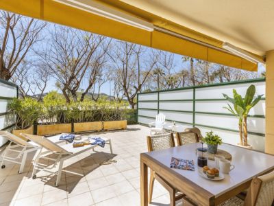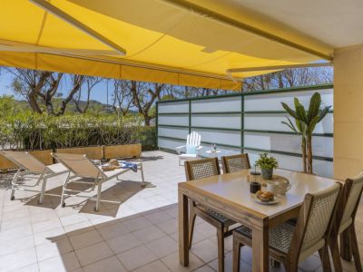 Terrasse privée avec store banne jaune, table à manger en bois et espace solarium avec transats blancs, protégée par des parois d'intimité.