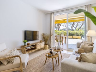 Salon lumineux avec mobilier en bois, tapis en jute et tables en rotin, s'ouvrant sur une terrasse ensoleillée par de larges baies vitrées.