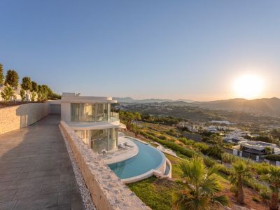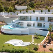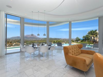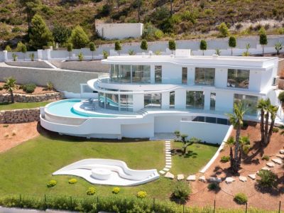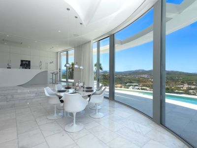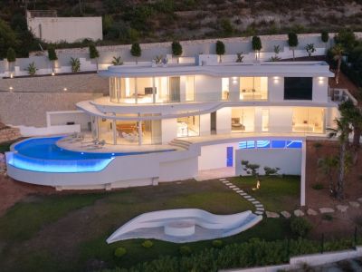 Ce chef-d'œuvre architectural contemporain est situé en position dominante à Jávea, offrant une expérience de vie sophistiquée avec des vues imprenables sur la vallée, le Montgó et la mer Méditerranée. La propriété se distingue par ses lignes courbes organiques et une façade entièrement vitrée permettant une intégration totale avec l'environnement naturel. Répartie sur plusieurs niveaux reliés par un ascenseur en verre design, la demeure dispose de finitions haut de gamme, notamment des sols en marbre et un système d'éclairage LED intégré.