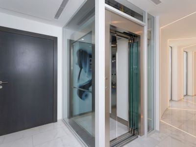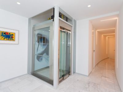 Ascenseur moderne en verre et acier inoxydable, sol en marbre blanc et couloir avec éclairage LED linéaire intégré aux parois.