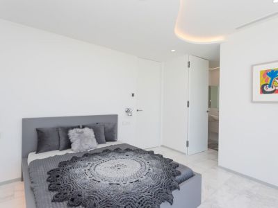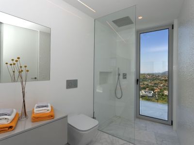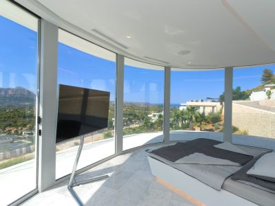 Chambre moderne avec de grandes baies vitrées offrant une vue sur le Montgó. Comprend un sol en marbre, des spots encastrés et des haut-parleurs intégrés au plafond.