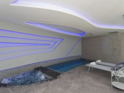 Espace bien-être intérieur comprenant un bassin avec jacuzzi, éclairage LED futuriste, revêtement de sol en pierre grise et chaises longues de relaxation.
