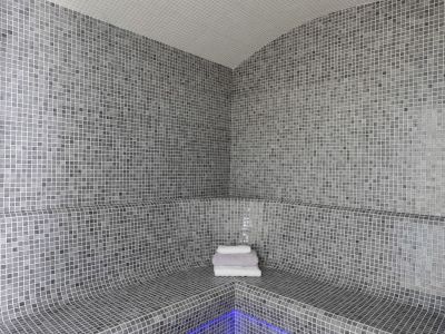 Hammam moderne avec parois en mosaïque grise, bancs ergonomiques éclairés par des LED bleues et plafond voûté en tesselles blanches.