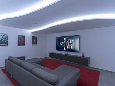 Salle de cinéma privée dotée d'un plafond aux lignes ondulées avec éclairage LED, un canapé d'angle en cuir gris et une unité multimédia suspendue.