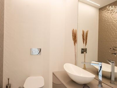 Salle d'eau moderne avec vasque à poser ovale, meuble suspendu taupe et WC suspendu. L'éclairage LED linéaire souligne le mur à texture géométrique.