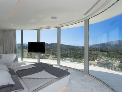 Chambre principale avec baies vitrées incurvées offrant une vue panoramique sur la mer et la montagne, sol en marbre blanc et lit minimaliste avec éclairage intégré.