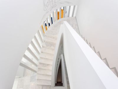 Vue plongeante d'un escalier tournant minimaliste avec des marches en marbre blanc et une balustrade à lattes verticales épurées.