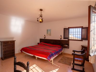 Chambre rustique avec tête de lit en bois sculpté, sol en terre cuite et lustre en fer forgé. Une fenêtre à barreaux et volets en bois apporte une lumière naturelle douce.