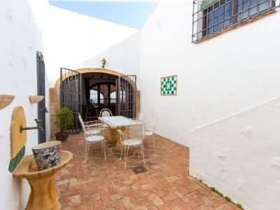 Patio méditerranéen avec sol en terre cuite à motifs, fontaine en pierre et mobilier en fer forgé blanc. Une arche avec grilles décoratives mène à l'intérieur.