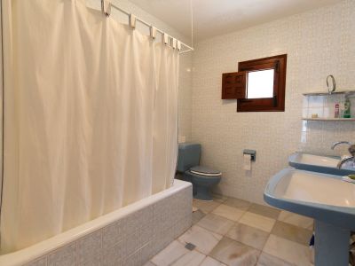Salle de bain traditionnelle avec double lavabo sur colonne bleu, WC assorti et baignoire carrelée. Murs ornés de carreaux à motifs et petite fenêtre en bois authentique.