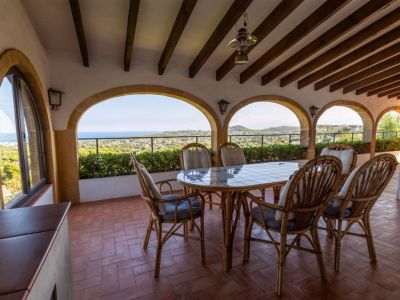 Terrasse couverte avec arches en pierre, poutres en bois et table en carrelage. La vue panoramique englobe la côte méditerranéenne et les montagnes environnantes.