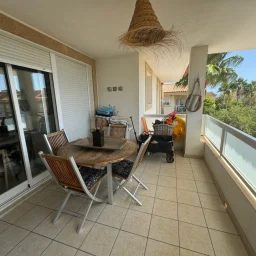 Terrasse privée avec salon en rotin, revêtement de sol en grès et accès par porte vitrée coulissante sous une toiture en tuiles canal.