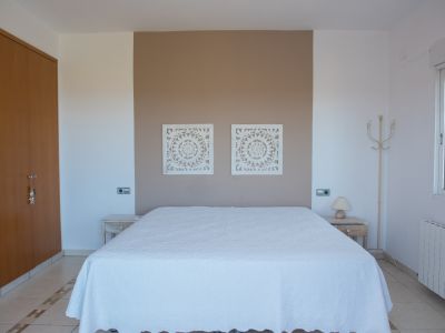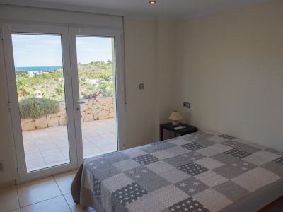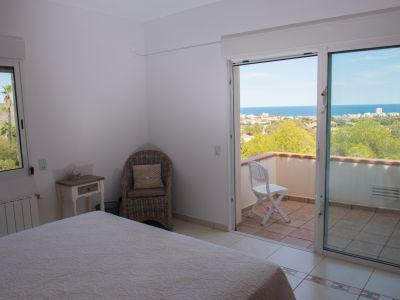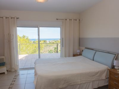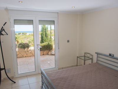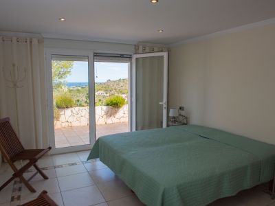 Chambre lumineuse avec accès direct à une terrasse carrelée par des portes vitrées, offrant une vue dégagée sur la mer et les collines environnantes.