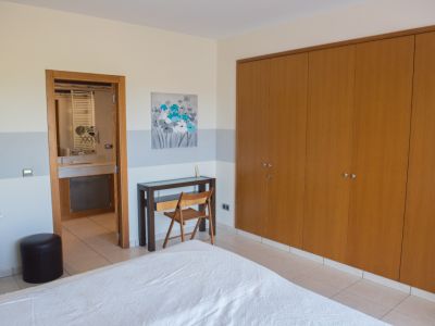 Chambre avec grand placard intégré en bois, espace bureau et vue sur la salle de bain attenante avec sol en carrelage.