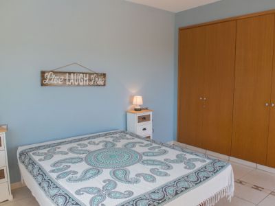 Chambre avec grand placard intégré en bois, murs bleu ciel et accès direct à une terrasse privée offrant une vue sur la mer Méditerranée.
