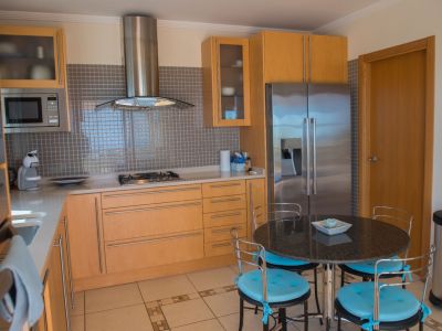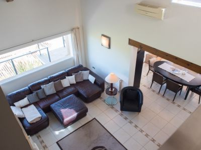L'espace extérieur est le cœur de la maison, avec une impressionnante piscine à débordement qui semble se fondre dans l'horizon bleu. L'espace terrasse est généreux, idéal pour les repas en plein air et la détente, complété par un jardin nécessitant peu d'entretien avec une végétation indigène. La propriété comprend un appartement d'invités indépendant au niveau inférieur, équipé de sa propre cuisine, d'un salon et de chambres, offrant une intimité pour les visiteurs ou les membres de la famille.