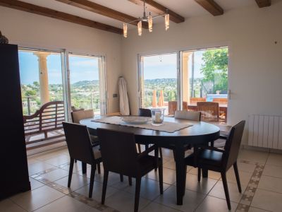 Salle à manger avec table ovale en bois sombre et poutres apparentes. De grandes baies vitrées offrent une vue panoramique sur la vallée et un accès direct à la terrasse.