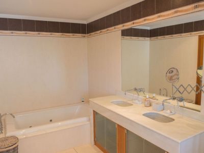 Salle de bain avec double vasque en pierre, robinetterie murale et baignoire balnéo encastrée, agrémentée d'un carrelage mural avec frise décorative.