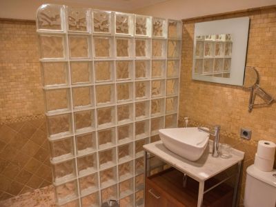 Salle de bain avec paroi de douche en briques de verre, murs en mosaïque beige et vasque à poser sur plan en marbre avec meuble en bois.