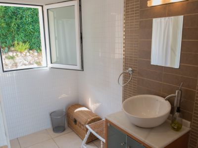 Salle de bain moderne avec vasque à poser, mur d'accent en carreaux bruns et fenêtre ouverte offrant une vue sur la végétation extérieure.