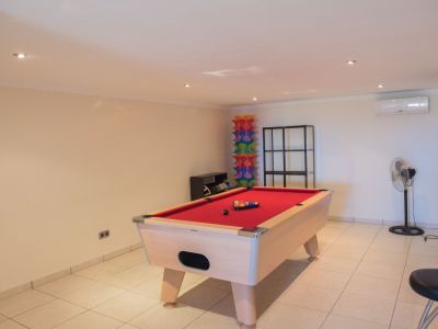 Salle de jeux spacieuse avec billard au tapis rouge, sol en carrelage clair, éclairage encastré au plafond et climatisation murale.