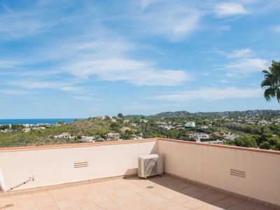 Terrasse sur le toit avec carrelage en terre cuite offrant une vue panoramique sur le littoral méditerranéen, les collines et les quartiers résidentiels.