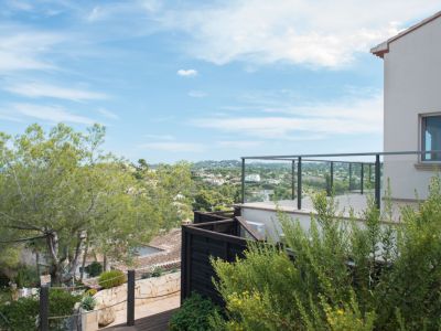 Terrasse surélevée avec carrelage en terre cuite et garde-corps en verre, offrant une vue panoramique sur les collines méditerranéennes et les villas.