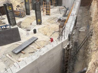 Phase de fondation présentant des murs de soutènement en béton armé et des coffrages verticaux pour les colonnes structurelles du bâtiment.