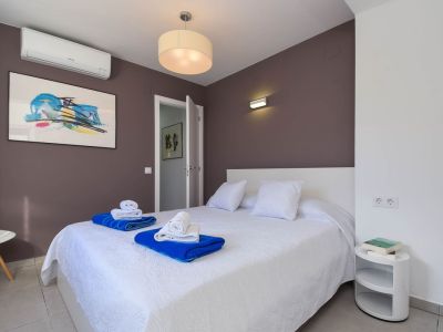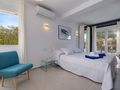 Chambre lumineuse avec lit double, fauteuil turquoise et table de chevet en verre. Équipée de la climatisation et d'un accès direct au jardin par baie vitrée.