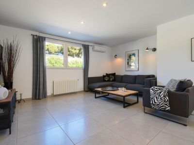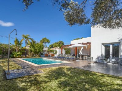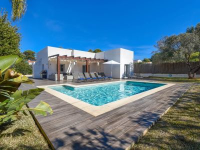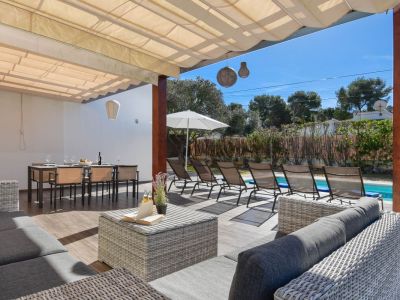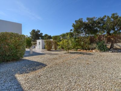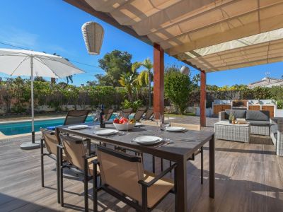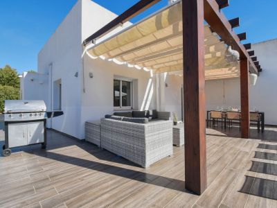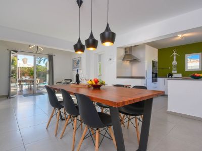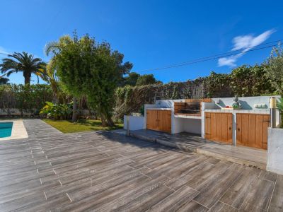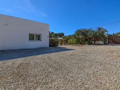 L'extérieur est conçu pour profiter du climat méditerranéen, avec une grande terrasse en grès cérame entourant une piscine privée de dimensions généreuses. Une grande pergola en bois avec store rétractable ombrage les zones de repas et de détente extérieures, complétées par une cuisine d'été avec barbecue en maçonnerie. Le terrain est totalement plat, facilitant l'accès et offrant un entretien simple avec des zones de gravier et une végétation locale, ainsi qu'un grand espace de stationnement privé.
