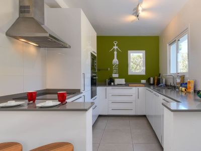 Cuisine moderne avec meubles blancs, plans de travail gris et mur vert. Comprend des appareils intégrés, un bar avec tabourets en bois et une hotte aspirante en inox.